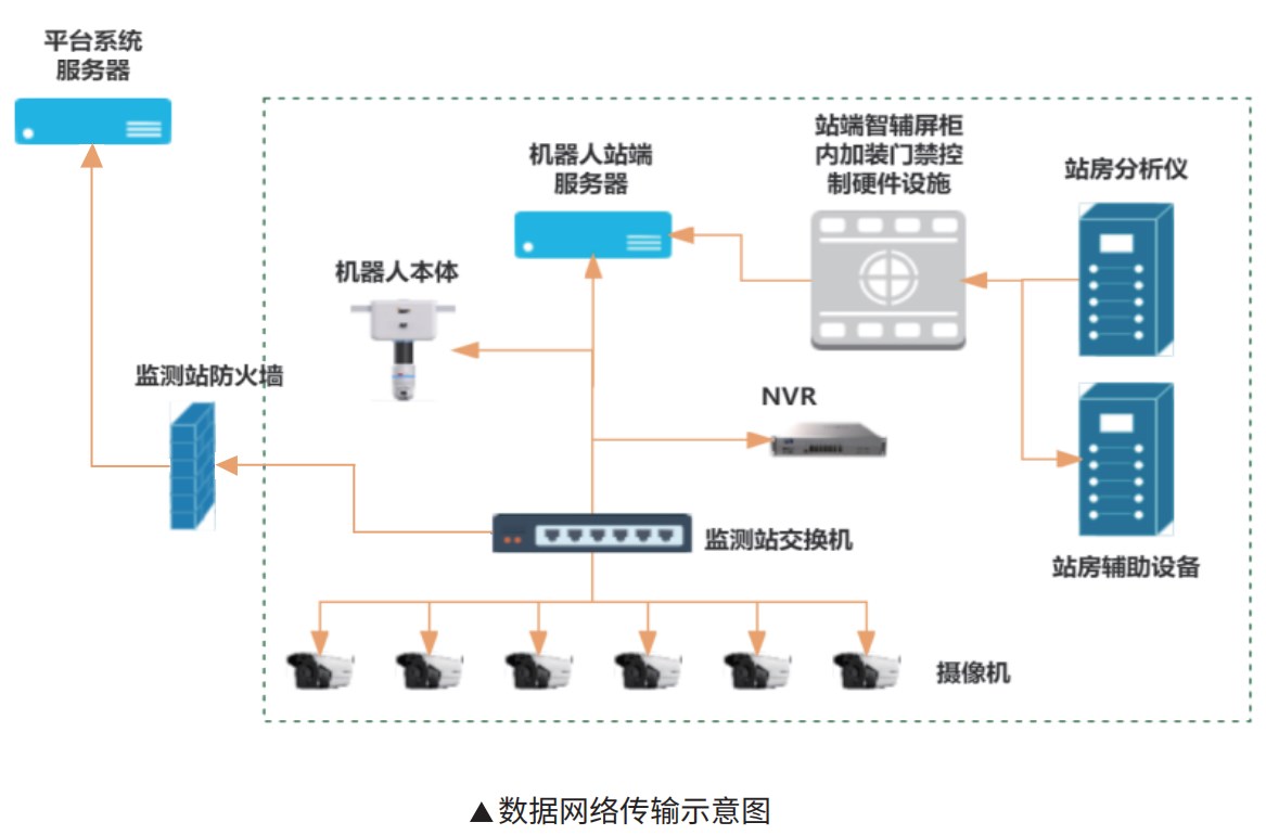 數(shù)據(jù)傳輸更是系統(tǒng)中的關(guān)鍵。運(yùn)維機(jī)器人通過TCP協(xié)議接入站端服務(wù)器,站房分析儀和輔助設(shè)備數(shù)據(jù)實(shí)時(shí)上傳,而攝像機(jī)視頻數(shù)據(jù)通過交換機(jī)接入NVR,再傳送至站端服務(wù)器。站端服務(wù)器匯總站房監(jiān)測(cè)數(shù)據(jù),經(jīng)防火墻上傳至上級(jí)平臺(tái)系統(tǒng)服務(wù)器,確保數(shù)據(jù)傳輸?shù)陌踩€(wěn)定。